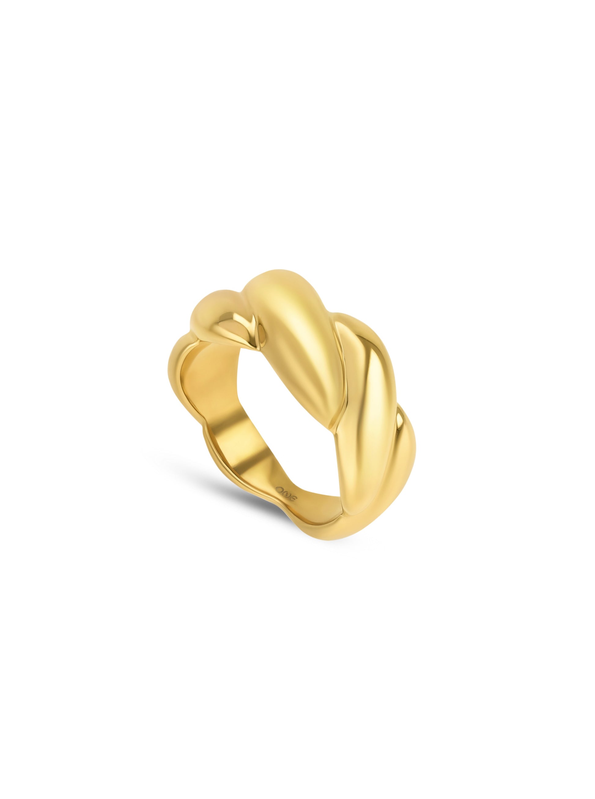 El anillo Bold 09 dorado destaca por su forma asimétrica y trenzada. Totalmente dorado y liso, el anillo es más estrecho en su base respecto a la parte superior, donde se resalta el efecto trenzado y es de mayor tamaño. Una pieza un tanto atemporal, que se puede utilizar sola para ser más llamativa o en combinación con otros anillos de diferentes colores o dimensiones. La colección Bold se compone de piezas verdaderamente llamativas en forma de anillos.