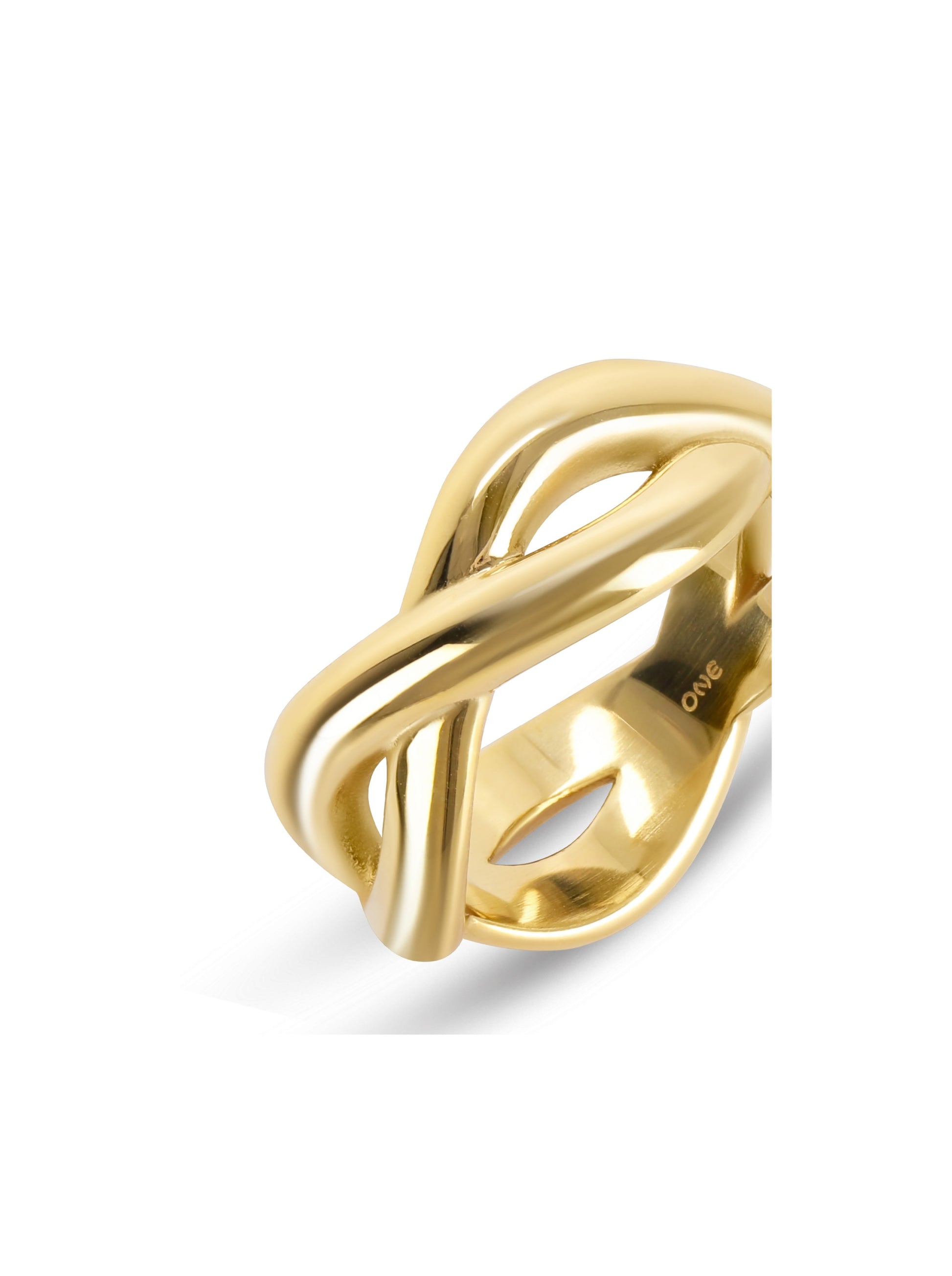 El anillo Cruzado de la colección Infinity destaca por su diseño entrelazado alrededor de todo el anillo. La forma del anillo, con dos bandas doradas entrelazadas y superpuestas, forma varios símbolos del infinito. Una joya que se puede llevar sola o combinada con otras piezas de ONE y de la propia colección que rinde homenaje al símbolo del infinito y al motor de ONE que es el tiempo.