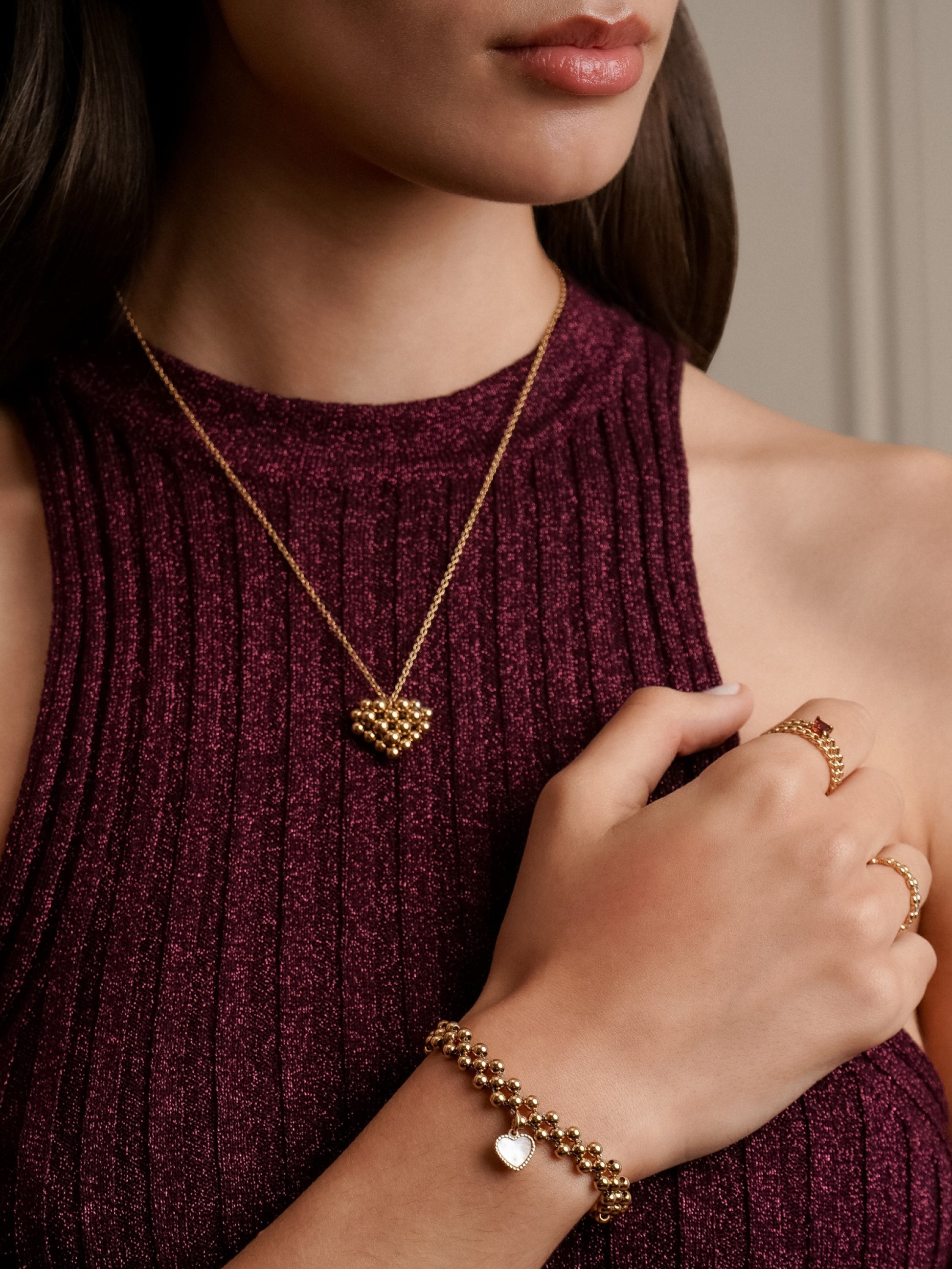 El anillo ONE London 46 dorado de la colección London es un anillo fino con un entramado de pequeños eslabones entrelazados y espaciados entre sí, y un pequeño cristal de circonio rojo oscuro en forma rectangular en la parte superior. Es una pieza de joyería con un diseño delicado, que destaca por su detalle central, diferenciándose al combinarse con otros anillos. El entrelazado continuo del diseño recuerda al de un collar y crea un efecto visual armonioso, perfecto para combinar con otros anillos de ONE.