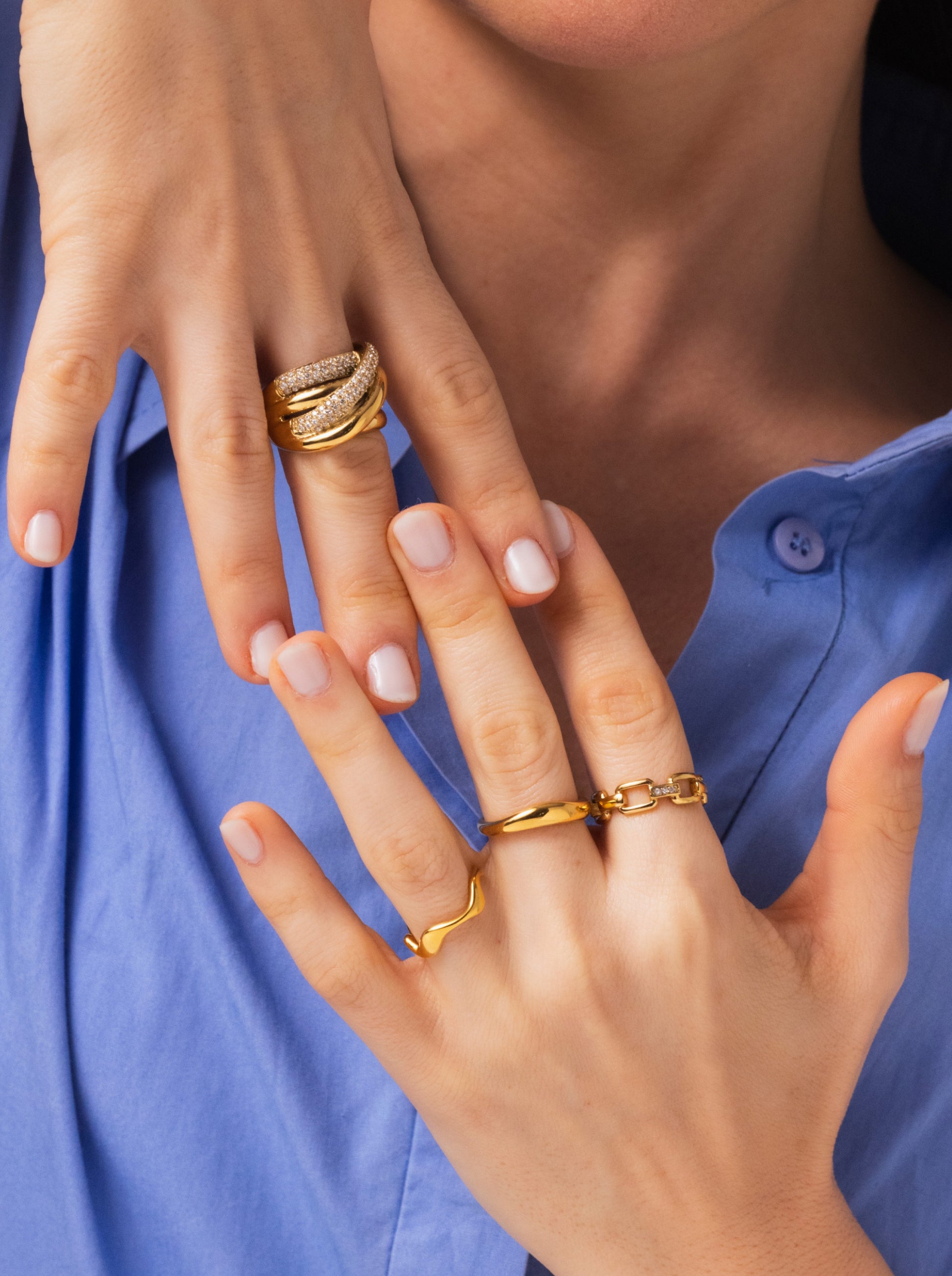 El anillo Square de la colección Luminous se distingue por su forma geométrica. Un anillo dorado con cuadrados unidos por eslabones con cristales de circonitas hacen de este anillo una pieza versátil que puede usarse con otros anillos o de forma individual.