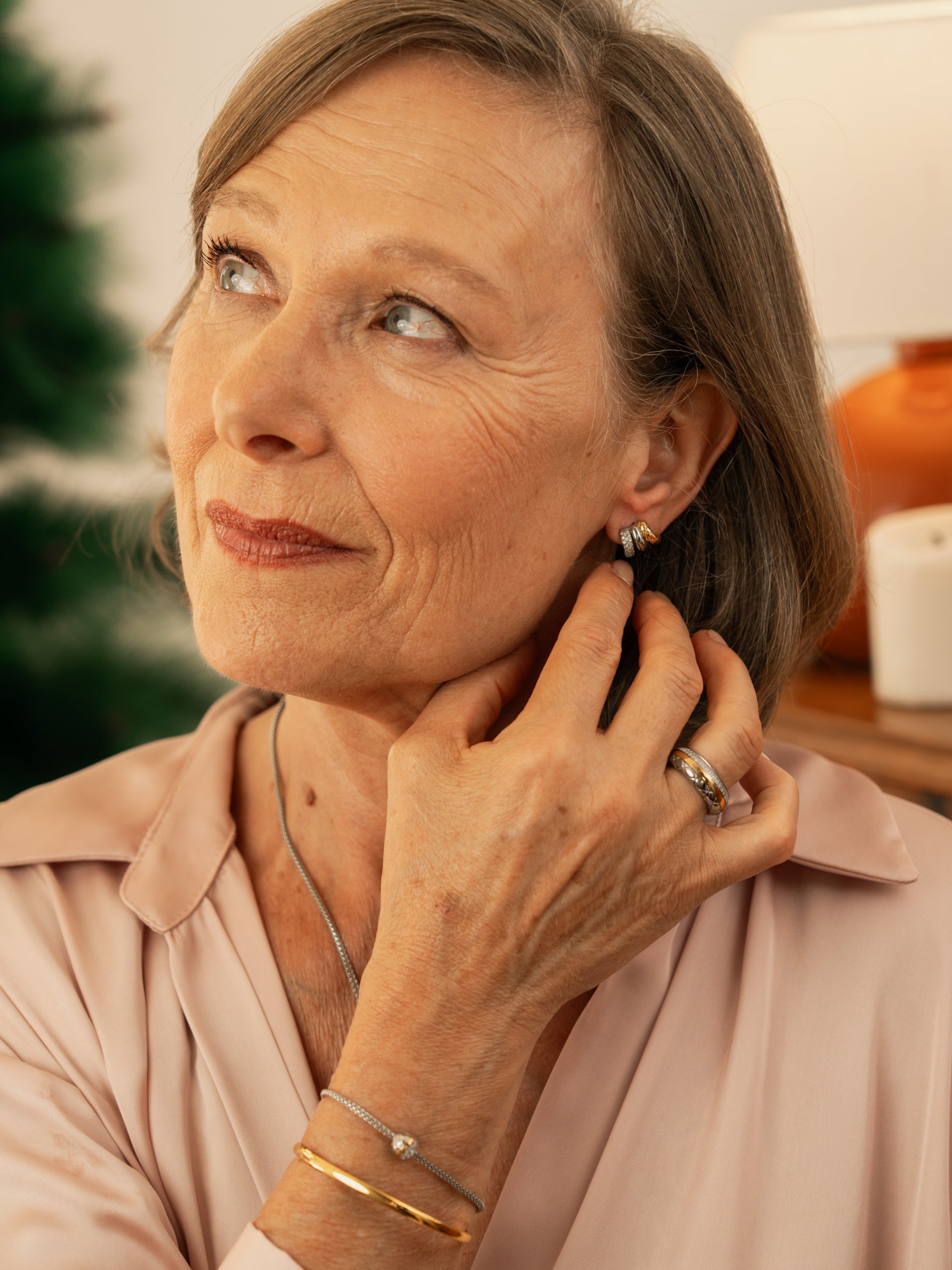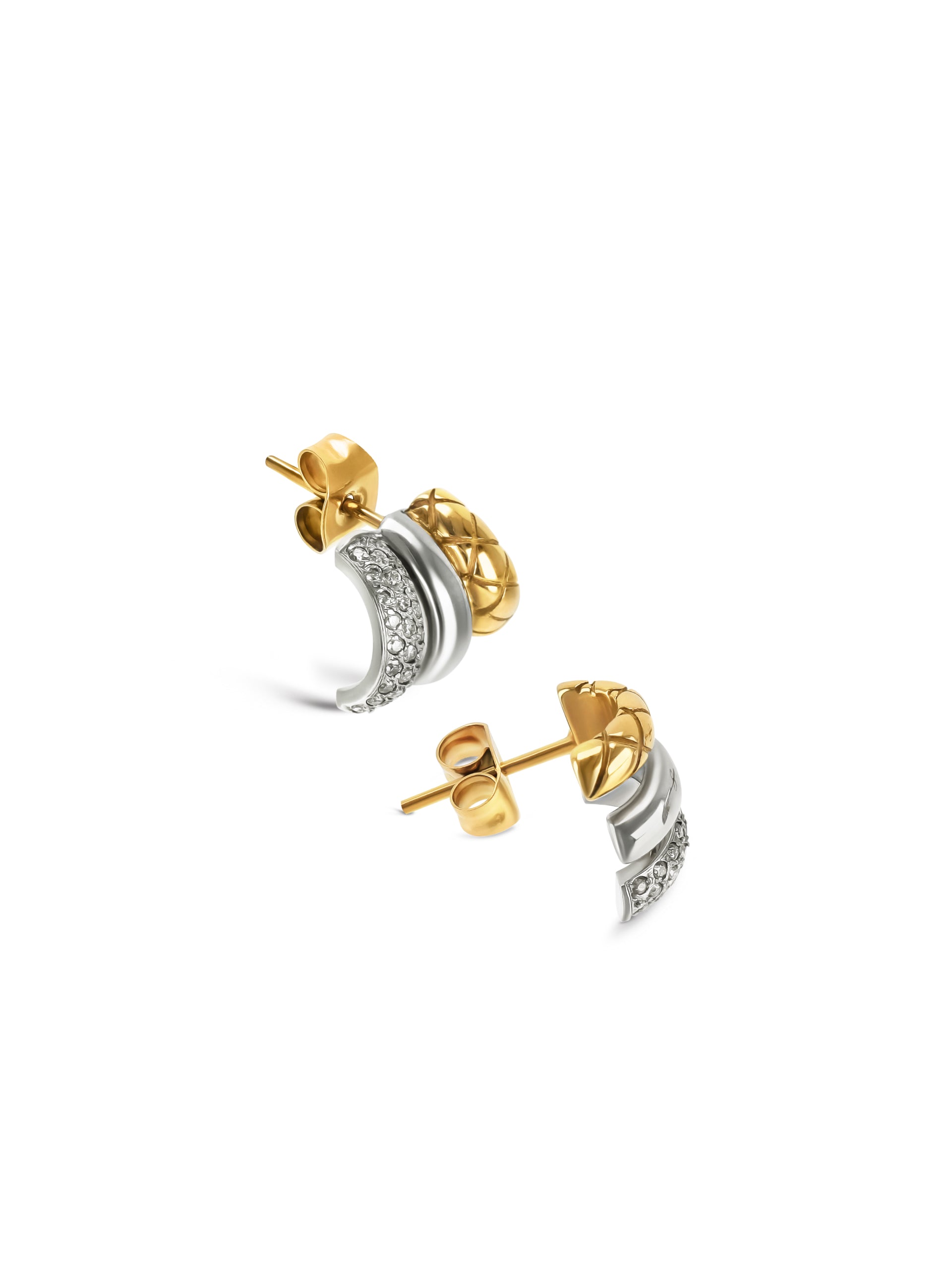 Los pendientes Triple de la colección Delightful siguen la tendencia de la joyería mixta de metales: combinan elementos de plata y oro en una sola pieza. Son unos pendientes de púas muy pequeños pero que gracias a su diseño parecen ear cuffs. Están formados por tres pequeños medios anillos, uno de ellos completamente plateado, otro dorado con un patrón geométrico y un tercero también plateado pero cubierto de cristales blancos. Pendientes muy discretos que realzan tu juego auditivo gracias a los diversos detalles que presentan.