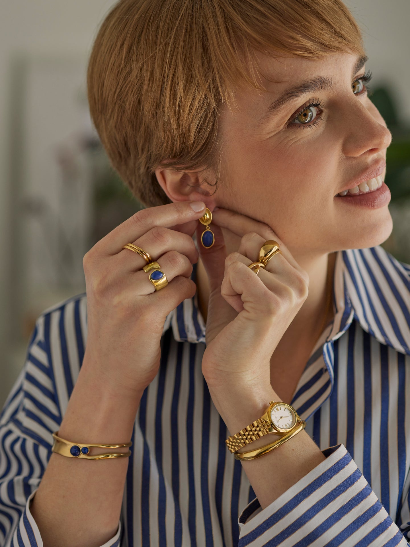 Minimalismo con presencia. Los pendientes Long ELEMENT son una auténtica declaración de estilo: la piedra azul profunda, de acabado liso y forma ovalada, está rodeada por una estructura orgánica de acero inoxidable bañado en oro de alto brillo, creando un contraste sofisticado que realza su diseño artístico. Con cierre de botón y mariposa, ofrecen comodidad y seguridad. Una pieza que transmite fuerza, estilo y una conexión con la esencia natural.