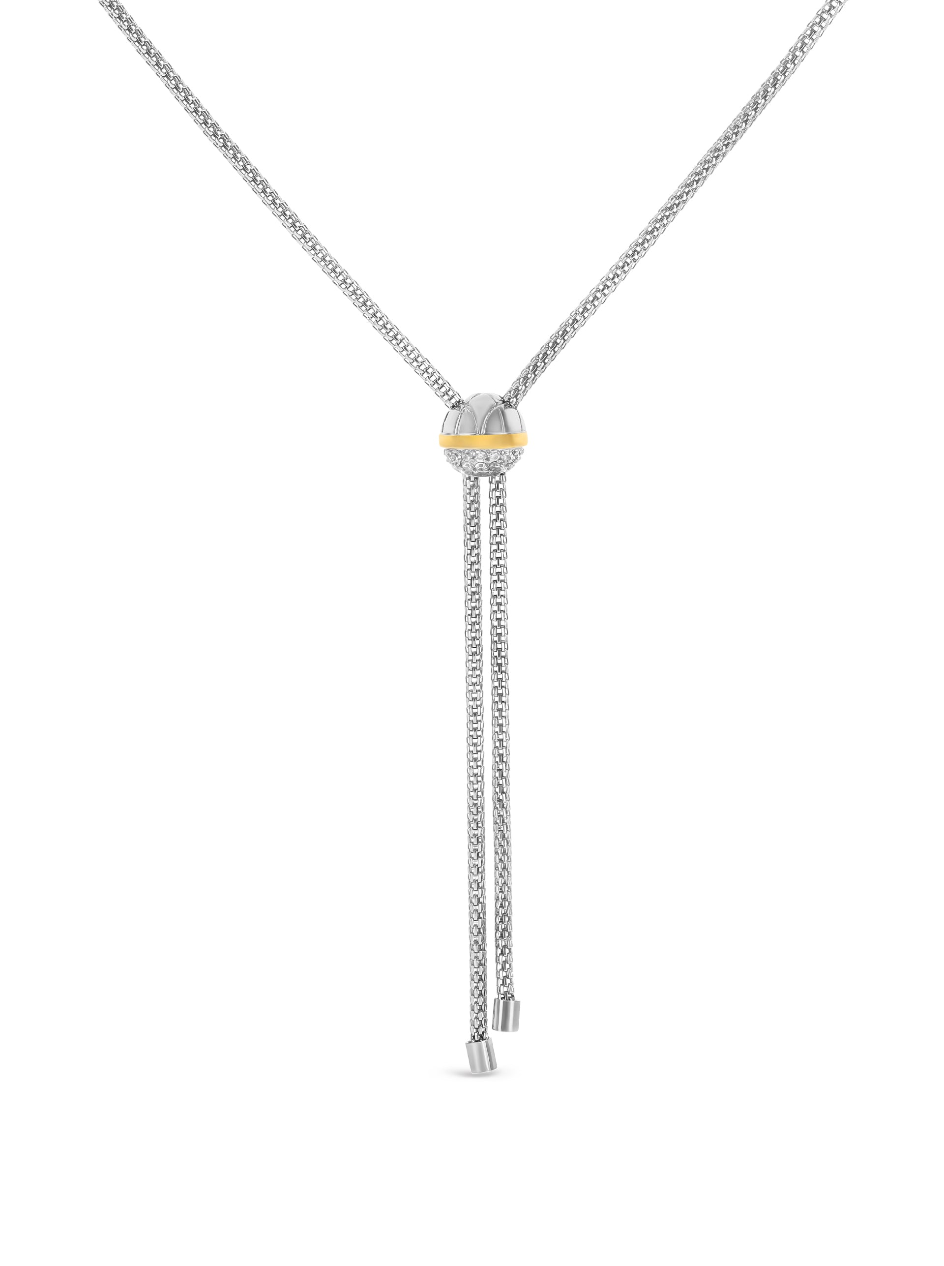 El collar de la colección Delightful es una pieza elegante que se distingue de otros collares ONE por su forma: un collar sin cierre que se ajusta a varias longitudes a través de su colgante principal. El colgante, una esfera plateada con un patrón geométrico en su parte superior y cristales incrustados en la parte inferior, dividida por una banda dorada, deja pasar los dos hilos de la malla plateada del collar hacia el frente, permitiendo que quede más ajustado alrededor del Cuello o más suelto. Un collar perfecto para llevar con escotes más acentuados o encima de una camisa completamente abotonada, debajo del cuello.