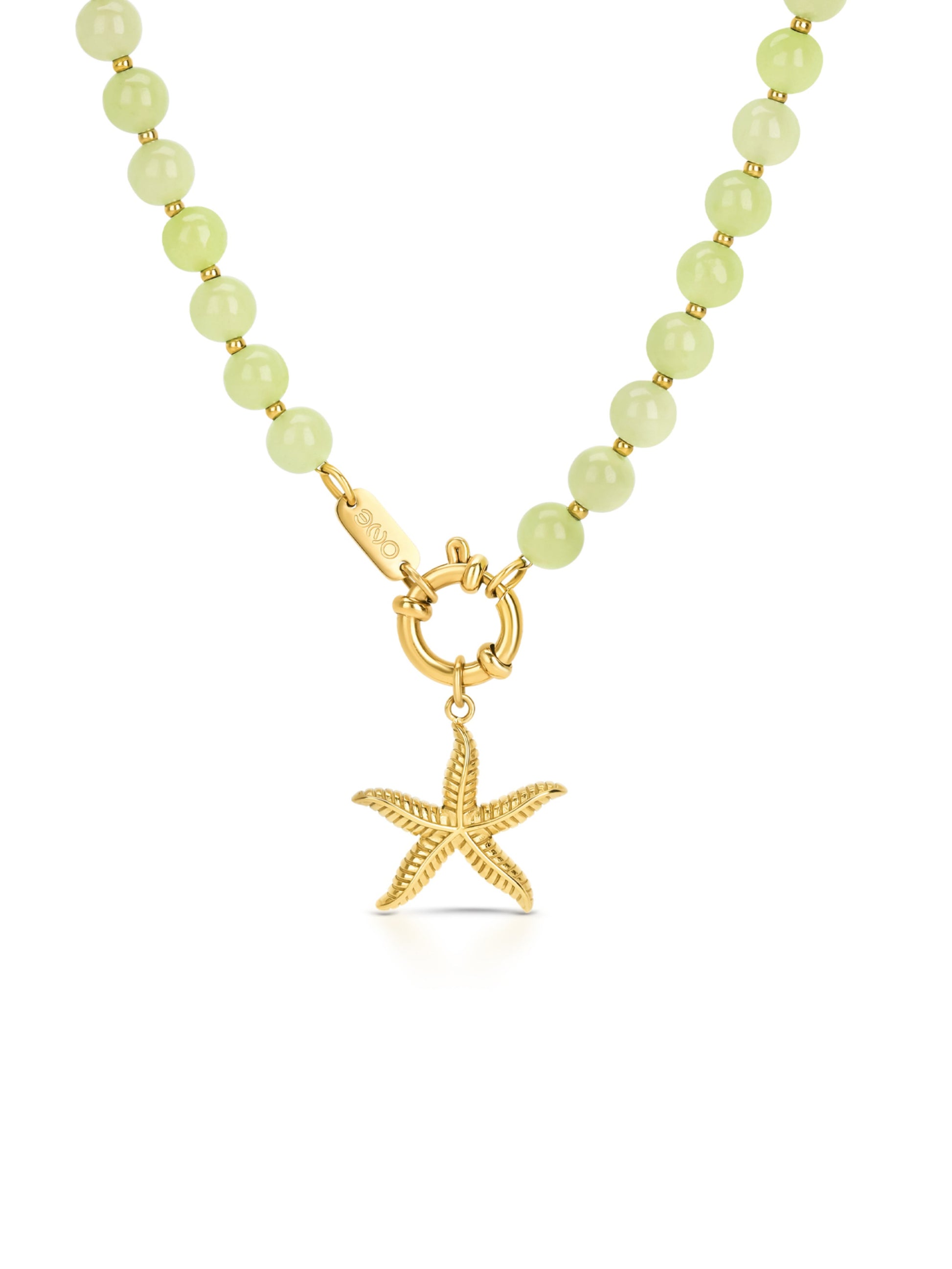 El collar Carmela es una pieza con un diseño natural y sofisticado ideal para quienes valoran la autenticidad en los detalles. Presenta una cadena de cuentas de cuarzo verde de tamaño medio intercaladas con pequeñas cuentas doradas que aportan brillo y contraste al conjunto. Cada piedra es única y puede mostrar variaciones sutiles de color y textura que refuerzan su carácter orgánico y natural. El collar termina con un anillo dorado que actúa como cierre frontal añadiendo un detalle moderno y funcional. De este anillo cuelga un colgante en forma de estrella con forma irregular textura marcada y volumen tridimensional que añade un toque original y contemporáneo a la pieza. Un collar versátil con equilibrio entre lo clásico y lo moderno ideal para llevar solo o combinado con otros collares.