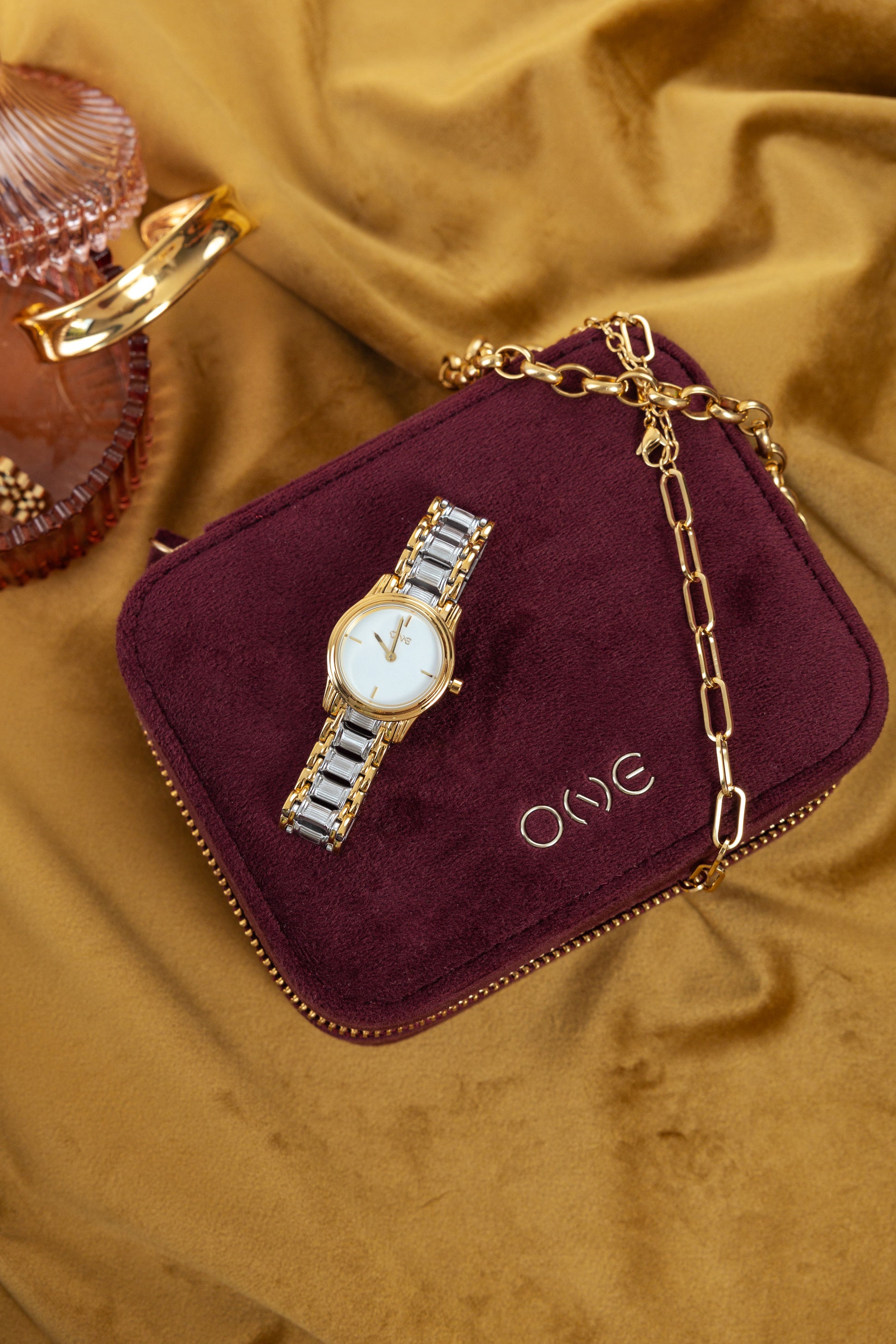 El reloj Empire Gold & Silver combina un diseño clásico y sofisticado con la tendencia mix & match entre dorado y plateado. El protagonismo recae en la correa bicolor de acero inoxidable, la verdadera estrella de esta creación. Con un diseño formado por eslabones centrales plateados interconectados con eslabones laterales dorados, esta combinación de tonos eleva la elegancia del modelo y lo hace perfecto para combinar con distintos estilos y accesorios. La esfera blanca mantiene el equilibrio visual de la pieza, realzada por los índices finos y dorados y las agujas delicadas en la misma tonalidad. El Empire Gold & Silver es ideal para quienes buscan un accesorio versátil, capaz de pasar con naturalidad y elegancia del día a día a las ocasiones más especiales.