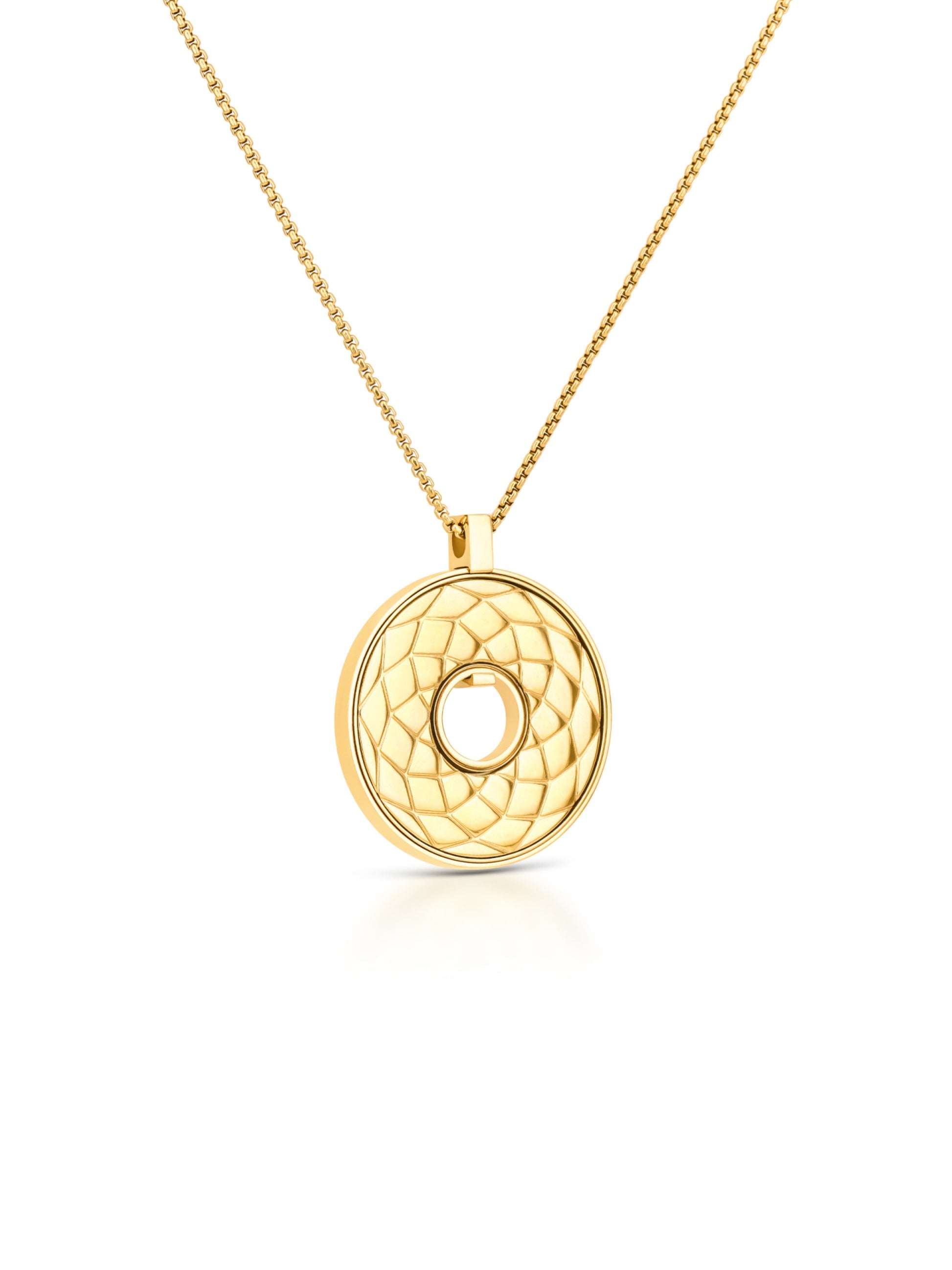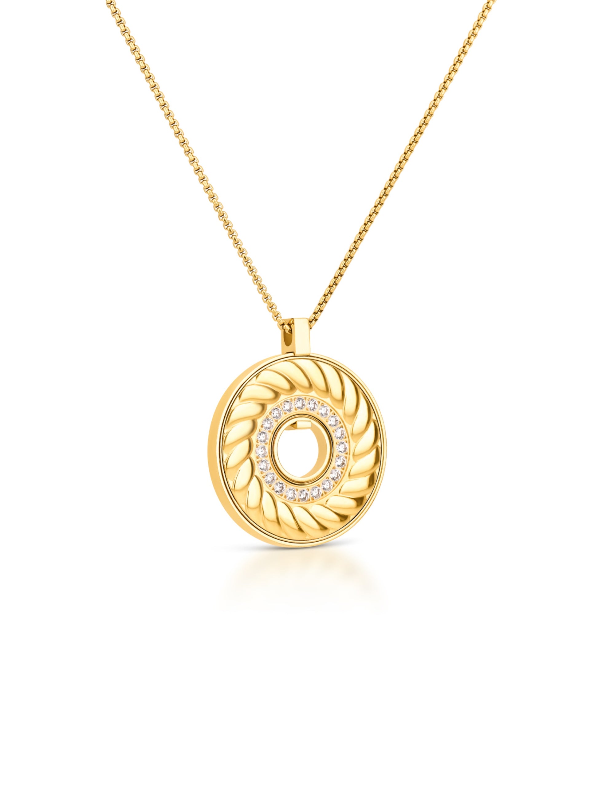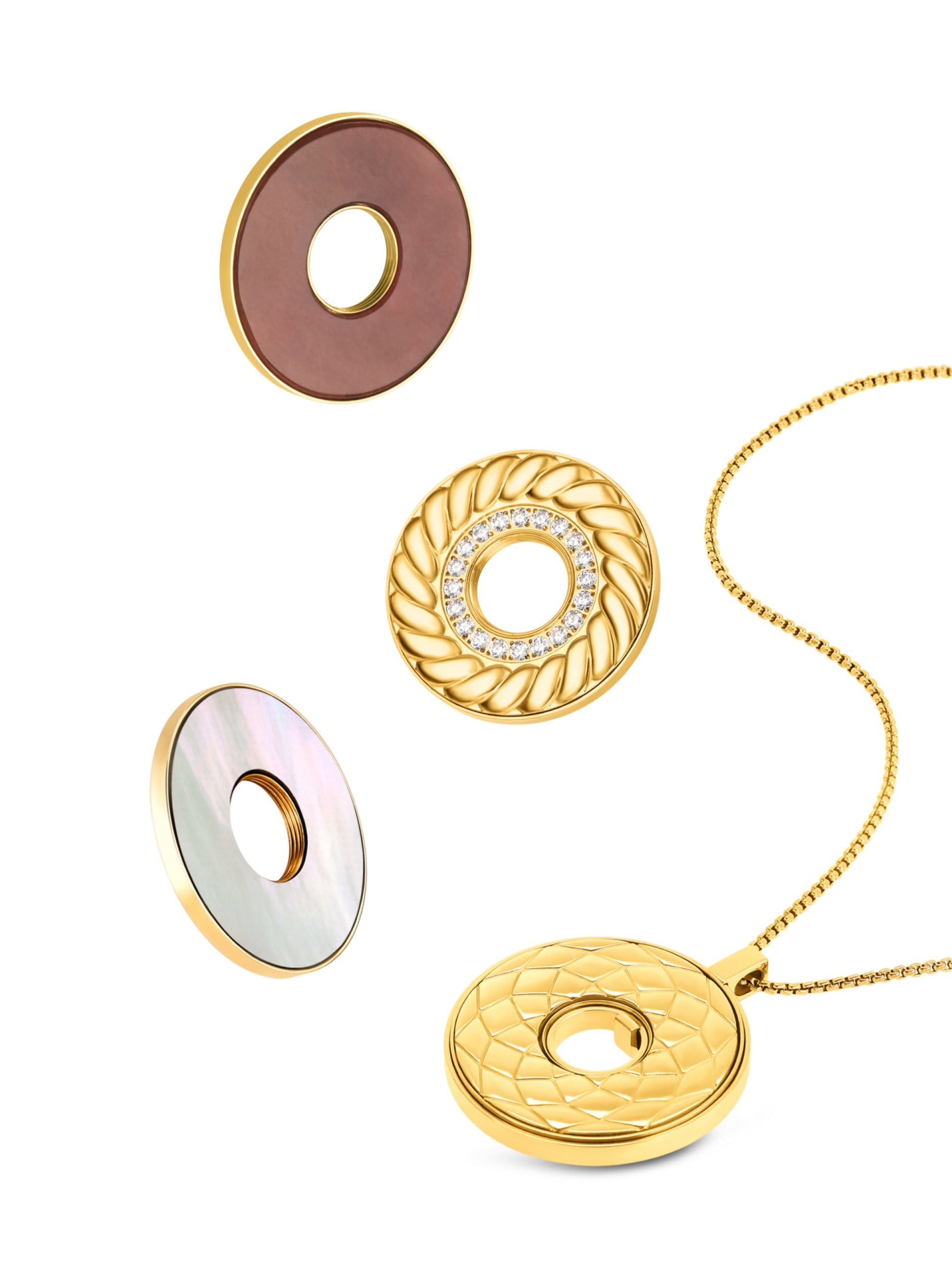 El Set Mood Crystal está compuesto por un collar y cuatro medallas, ideal para quienes disfrutan reinventarse a través de los detalles y crear combinaciones que reflejan distintos estados de ánimo y momentos. Con una cadena dorada delicada, formada por pequeños eslabones entrelazados, el collar destaca por un colgante circular que sirve como base para las medallas incluidas en el set. Cada una de las cuatro medallas aporta una expresión única: la medalla con fondo rojo texturizado transmite audacia e intensidad; la de nácar con borde dorado ofrece un brillo suave y un toque de elegancia clásica; la medalla dorada con relieve en la parte superior y engaste de circonitas blancas en el borde interior irradia sofisticación y brillo; y la última, también dorada, presenta un relieve de formas geométricas, ideal para un look moderno con personalidad. El cierre de mosquetón y los eslabones de extensión permiten ajustar el largo del collar, haciéndolo aún más versátil. Un collar, cuatro estilos: el Set Mood Crystal ha sido pensado para mujeres que desean explorar su identidad cada día, con libertad y autenticidad.